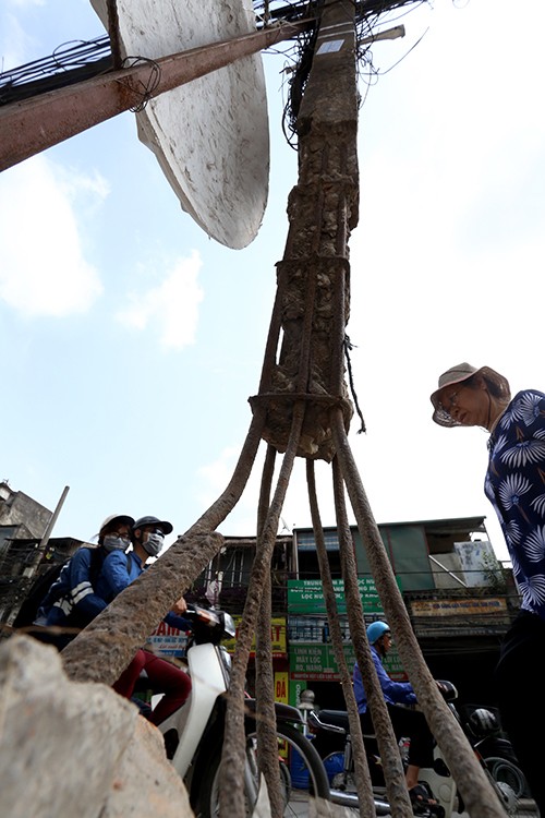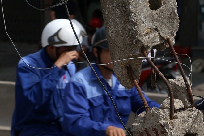 Có cột vỡ hết phần bê tông và ngả xuống đường. "Hơn một năm qua, trong quá trình giải phóng mặt bằng những ngôi nhà mặt tiền, không hiểu sao những cây cột điện chỉ còn lõi thép như thế này, hàng ngày đi qua đây biết là nguy hiểm nhưng vẫn phải nhắm mắt bước qua", một người dân ở đường Trường Chinh than thở.