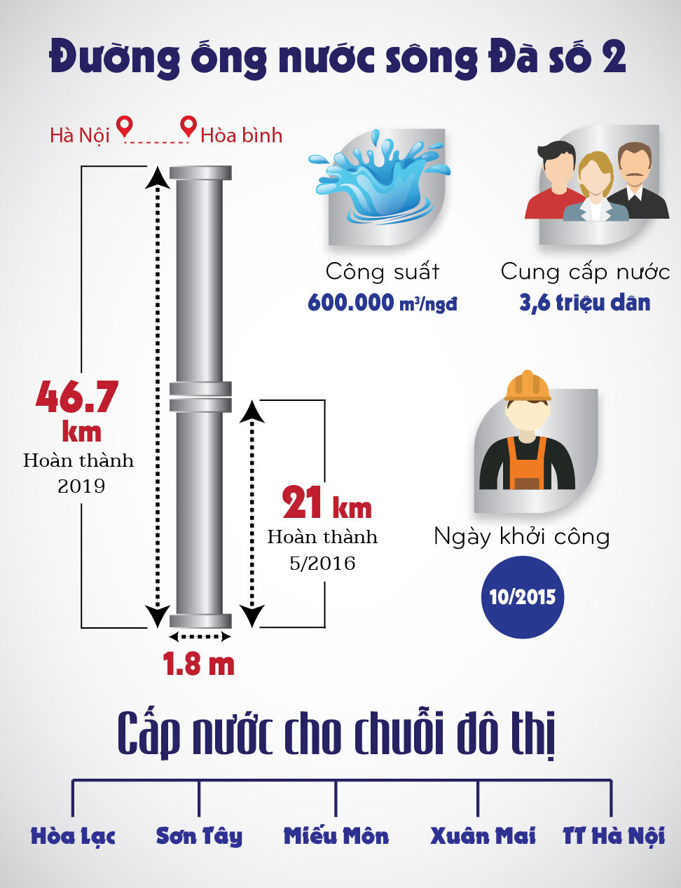 Đường ống nước sông Đà số 2 khởi công vào ngày 7.10.2015, được người dân kỳ vọng sẽ chấm dứt cảnh mất nước liên tục ở Thủ đô.