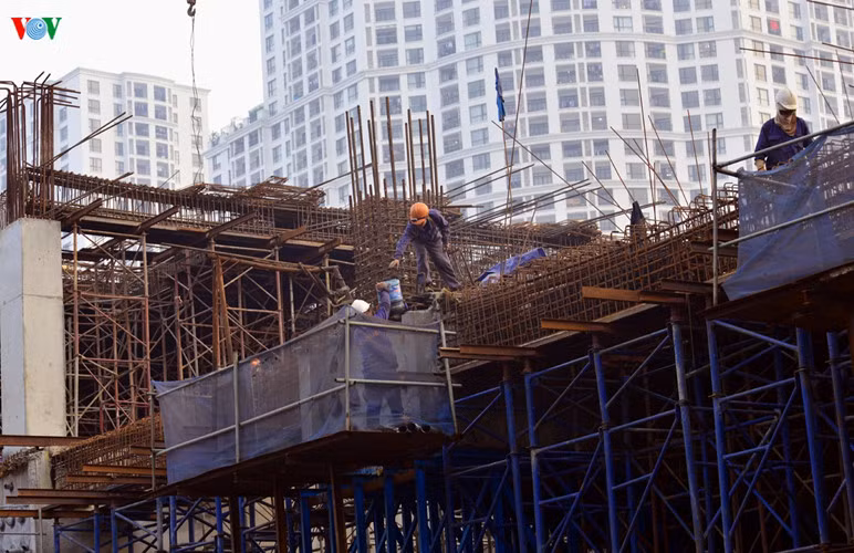 Các công nhân đang thi công nhà ga trên đường Láng.