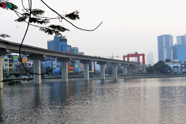 Đoạn đường sắt trên cao Cát Linh - Hà Đông đi qua Hồ Hoàng Cầu.