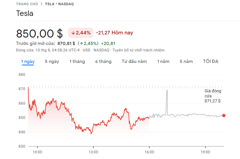 Các giao dịch diễn ra từ 5/8 – 9/8, sau cuộc họp cổ đông thường niên 2022 của Tesla, theo hồ sơ SEC tiết lộ. Cổ phiếu Tesla đã giao dịch gần như đi ngang nhiều giờ kể từ khi tin tức được công bố và đóng cửa ở mức 850 USD, giảm 2,44% so với hôm thứ ba.