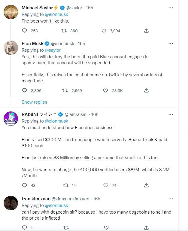 Quyết định của Musk ngay lập tức vấp phải rất nhiều phản ứng dữ dội trên nền tảng Twitter. Nhưng nhà sáng lập SpaceX và Tesla chỉ đưa ra quyết định cụ thể hơn về phí xác minh bắt buộc mới trong những tweet tiếp theo, đồng thời thay đổi tiểu sử Twitter của mình thành 'Nhà điều hành đường dây nóng khiếu nại Twitter'.