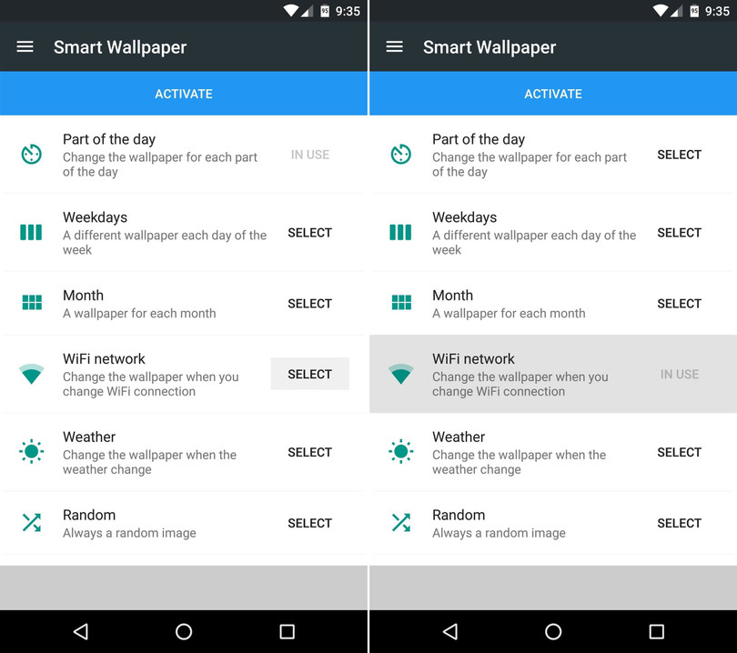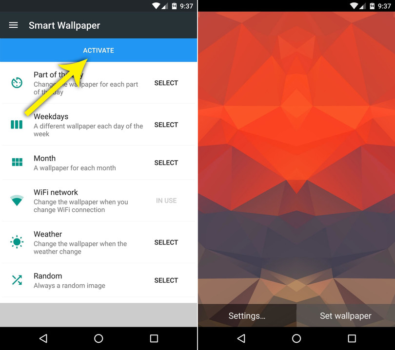 Việc duy nhất còn lại bây giờ là đặt Smart Wallpaper làm hình nền cho màn hình chủ. Sau khi hoàn tất việc chọn ảnh nền cho các điều kiện phụ, bạn hãy nhấn nút Back một lần để quay lại màn trình trước. Tại đó, bạn hãy nhấn nút Activate ở trên cùng màn hình và chọn Set Wallpaper ở màn hình tiếp theo.