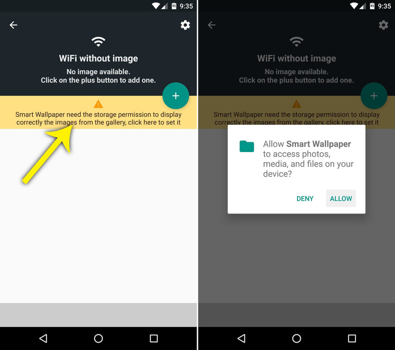 Nếu sử dụng Android Mashmallow hay cao hơn, bạn phải cấp quyền cho Smart Wallpaper truy cập vào thư viện ảnh. Bạn chỉ cần chạm vào thanh màu vàng ở gần trên cùng màn hình, rồi nhấn nút Allow ở pop-up hiện ra.