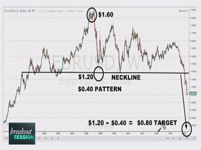 Với đồ thị trên, Ross dự báo đồng euro sẽ lập kỷ lục mới ở mức 0,8 USD đổi 1 euro. Ông tính toán mức giá này bằng cách lấy điểm cao nhất của giai đoạn này (1,60 USD đổi 1 euro) trừ đi điểm thấp nhất (trong trường hợp này đường viền cổ ở mức giá 1,20 USD đổi 1 euro). Sau đó lấy điểm kết nối hỗ trợ trừ đi con số 40 cent vừa tính ra để ra mức 80 cent đổi 1 euro.