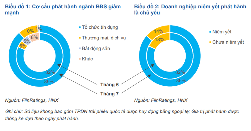 Đáng chú ý, trong tháng 7/2022, dữ liệu của FiinGroup chỉ ghi nhận duy nhất 1 đợt phát hành trái phiếu của doanh nghiệp bất động sản, cụ thể là CTCP Đầu tư Kinh doanh Bất động sản Hà An (thuộc Tập đoàn Đất Xanh) với giá trị đạt 210 tỉ đồng, chiếm vỏn vẹn 2% thị trường sơ cấp. Lưu ý rằng, doanh nghiệp bất động sản liên tục đứng thứ hai về cơ cấu phát hành trong nhiều tháng trước đó.