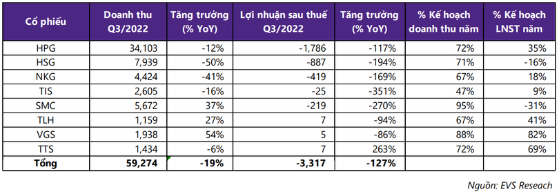 Hiện tại, hầu hết các doanh nghiệp ngành thép đã công bố báo cáo tài chính quý 3/2022. Theo đó, doanh thu và lợi nhuận của 8 doanh nghiệp thép lớn nhất đạt 59.274 tỉ đồng và âm 3.317 tỉ đồng, lần lượt giảm 19% và giảm 127% so với cùng kỳ năm trước.