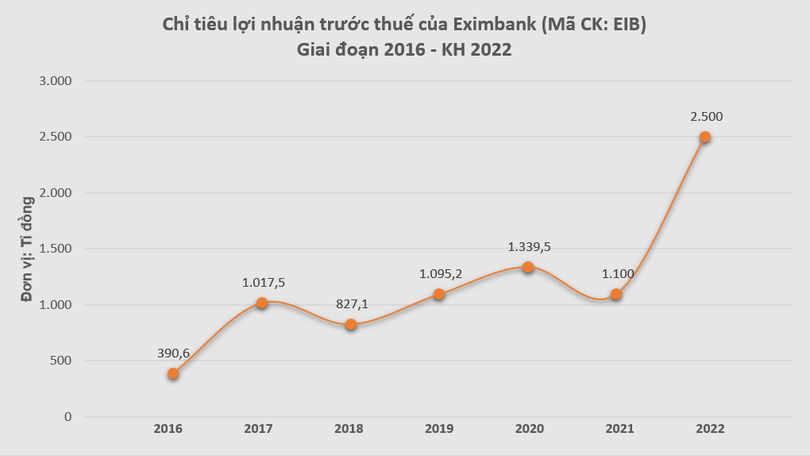 Trong năm 2022, Eximbank đặt mục tiêu lợi nhuận trước thuế lên tới 2.500 tỉ đồng, gấp 2,2 lần dự kiến năm trước; thu nhập ngoài lãi đạt 1.159 tỉ đồng, tăng 23% so với dự kiến năm 2021.