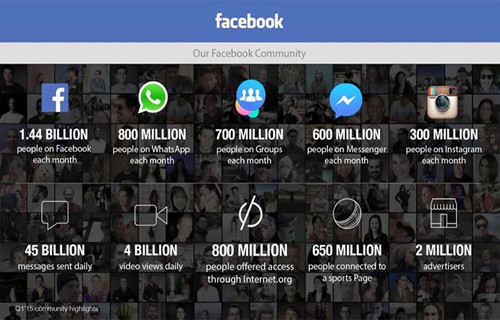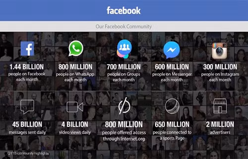 Tính đến hết quý I/2015, Facebook đã thu hút tới 1,44 tỷ thành viên hoạt động mỗi tháng. Nếu mạng xã hội này là một quốc gia thì đây là nước đông dân nhất thế giới, vượt cả Trung Quốc.