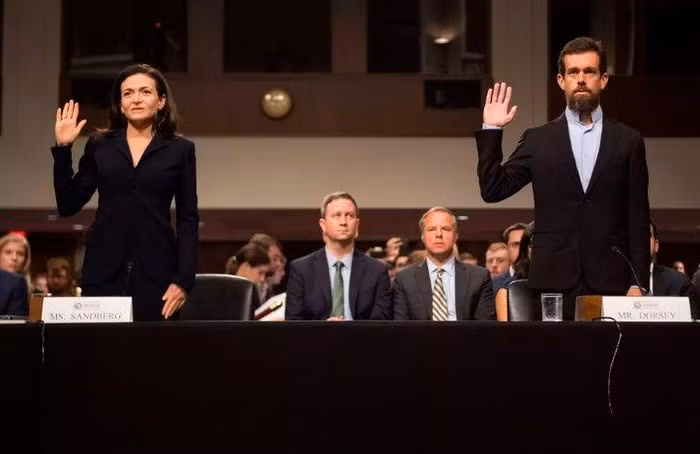 COO Sheryl Sandberg của Facebook (trái) và CEO Jack Dorsey của Twitter (phải) đã tuyên thệ làm chứng trước Ủy ban tình báo Thượng viện ở Capitol Hill ở Washington, DC hôm thứ 4.