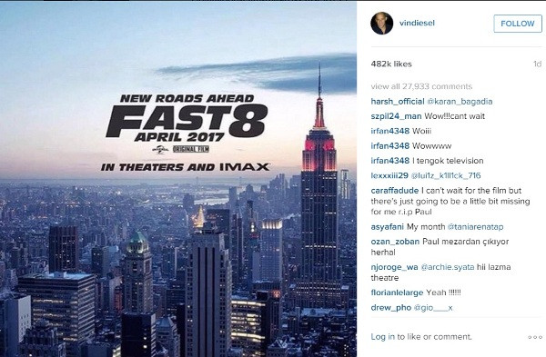 Ngay trước khi Fast & Furious 7 phát hành không lâu, ngôi sao Vin Diesel đã tiết lộ rằng Fast & Furious 8 đã được bật đèn xanh để thực hiện và phần phim Fast & Furious tiếp theo sẽ lấy bối cảnh tại New York. Bật mí này của anh mãi rất lâu sau mới được nhà sản xuất chính thức công bố và Universal Pictures cũng đã quyết định ngày ra rạp của dự án là 14/4/2017. Hôm nay, nam diễn viên tiếp tục làm fan của series nhượng quyền nổi tiếng như lên cơn sốt khi tiết lộ tấm poster đầu tiên trên trang Instagram của mình, tái khẳng định bối cảnh Fast 8 (Tên chính thức) chính là New York. Trên poster là dòng chữ: "New Roads Ahead" (tạm dịch: Đường đua mới đang ở phía trước), cùng thời điểm ra rạp của bộ phim.