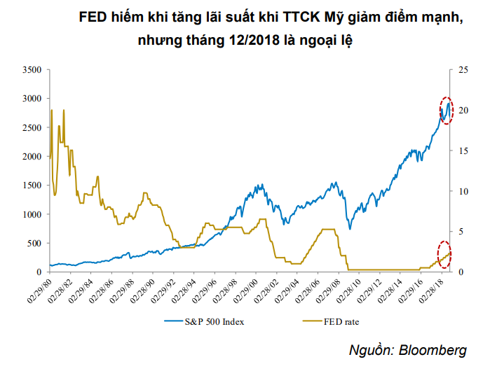 Trước cuộc họp, nhiều nhà đầu tư kỳ vọng đà lao dốc của thị trường chứng khoán (TTCK) Mỹ thời gian gần đây và lạm phát lõi của Mỹ đang cho xu hướng giảm, ở mức dưới mục tiêu 2% có thể là lý do khiến Fed xem xét chưa tăng lãi suất trong tháng 12. Căn cứ trên thực tế, quan sát của BVSC kể từ năm 1980 cho thấy, Fed hiếm khi tăng lãi suất trong những giai đoạn TTCK Mỹ giảm điểm mạnh.