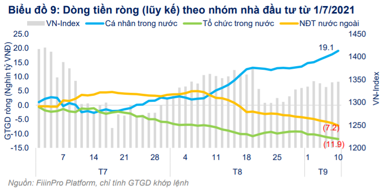 Trong bối cảnh nhà đầu tư nước ngoài duy trì trạng thái bán ròng mạnh và tổ chức trong nước cũng trong xu hướng bán ra kể từ đầu tháng 8/2021, thì dòng tiền từ nhà đầu tư cá nhân vẫn tiếp tục tăng mạnh.