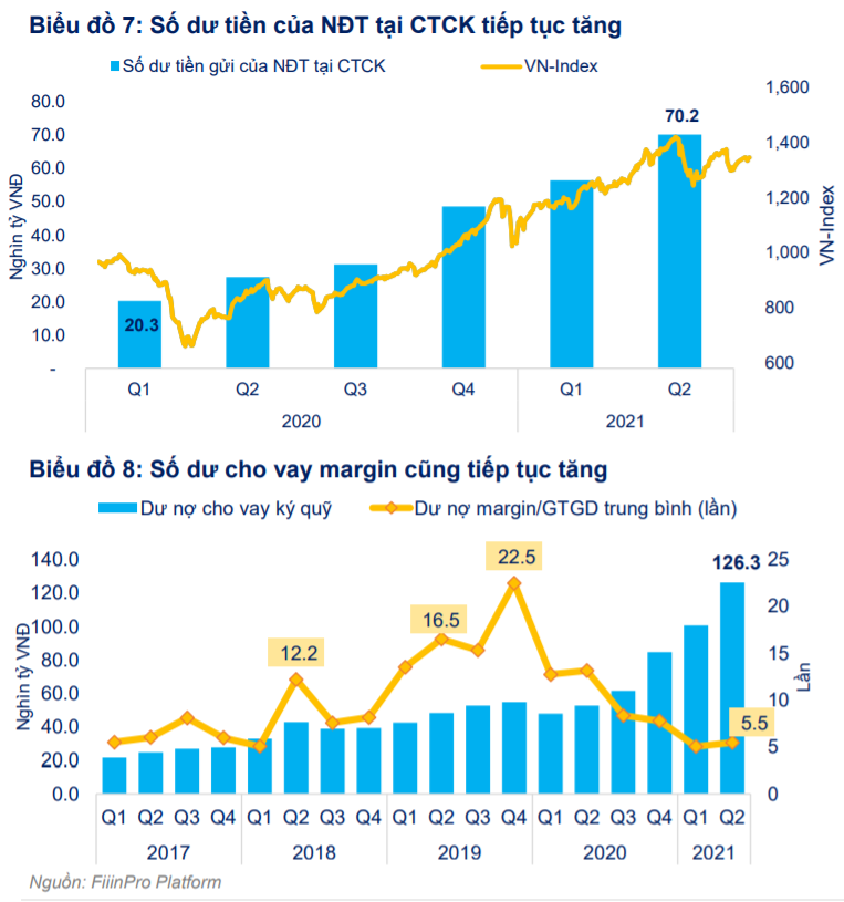 Theo FiinGroup, dư nợ cho vay margin vào cuối Quý 2/2021 đạt trên 126.300 tỉ đồng. Dư nợ hiện chỉ chiếm phần nhỏ so với thanh khoản, nhưng xu hướng tăng dần đều kể từ Quý 2/2020 đã khẳng định tâm lý ổn định và sự tự tin của chính các “nhà cái” đối với triển vọng của thị trường.