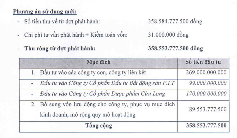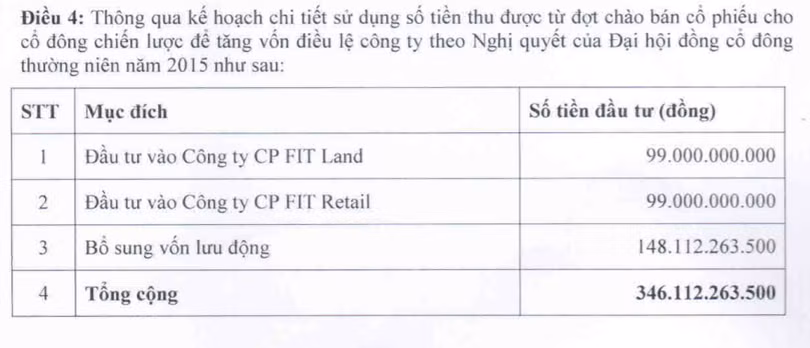 Nghị quyết này cũng thông qua kế hoạch chi tiết sử dụng số tiền thu được cho 3 mục đích: Đầu tư vào CTCP FIT Land (99 tỷ đồng); Đầu tư vào CTCP FIT Retail (99 tỷ đồng); Bổ sung vốn lưu động (148 tỷ đồng).