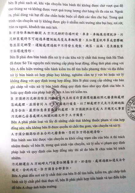 Cũng trong bản hợp đồng, Formosa có trách nhiệm bóc tách các chất độc hại khỏi bùn bánh, trước khi giao cho bên B vận chuyển đi xử lý. Bên B có quyền từ chối vận chuyển bùn nếu bên A thực hiện sai cam kết này.
