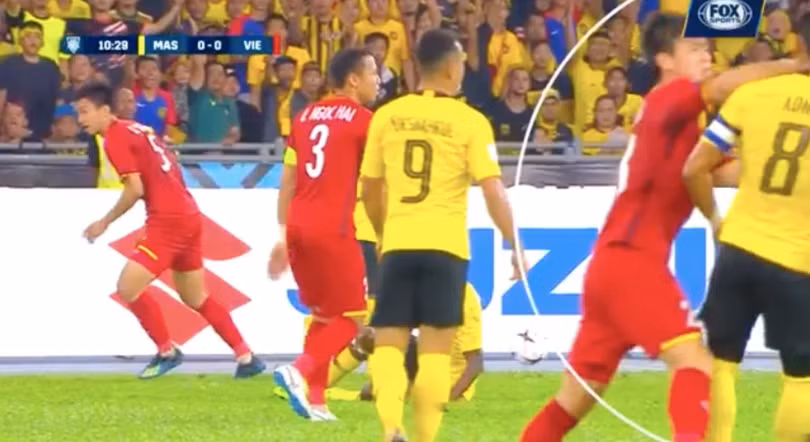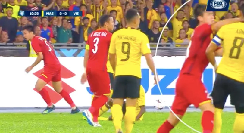 Khi trận đấu diễn ra được 10 phút, trung vệ Đỗ Duy Mạnh của Việt Nam dường như đã đánh cùi chỏ về phía đội trưởng Malaysia Zaquan Adha.