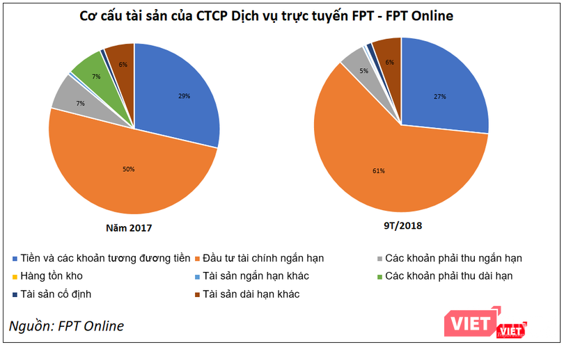 Tới cuối Quý 3/2018, tổng tài sản của FPT Online tăng lên mức 1.019 tỷ đồng, trong đó, các khoản Tiền và tương đương tiền, Đầu tư tài chính ngắn hạn tiếp tục có sự gia tăng tỷ trọng, chiếm tới 88%.