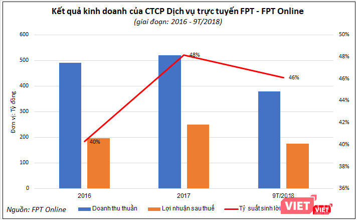 Năm 2017, doanh thu thuần của FPT Online đạt 519,67 tỷ đồng, tăng trưởng 6% so với năm 2016. Trong khi đó, lợi nhuận từ hoạt động kinh doanh năm 2017 đạt tới 313,79 tỷ đồng, (tăng trưởng 23,4% so với năm trước); lợi nhuận sau thuế đạt 250,22 tỷ đồng (tăng 26,8% so với năm trước).