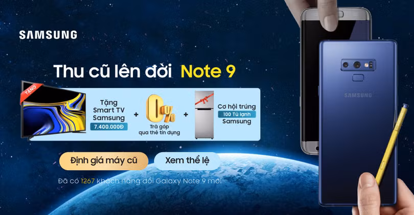Cũng trong tháng 10 này, người dùng smartphone cũ muốn nâng cấp lên Note 9 cũng có thể mang điện thoại của mình đến FPT Shop để tham gia chương trình “thu cũ, đổi mới”. Đáng chú ý, Samsung sẽ thu lại cả máy xách tay, không còn hộp, không còn đủ phụ kiện, thậm chí đã hết hạn bảo hành, kể cả bị trầy móp, tróc sơn. Bạn có thể xem danh sách các smartphone cũ được tham gia chương trình tại địa chỉ này: https://fptshop.com.vn/thu-cu-doi-moi