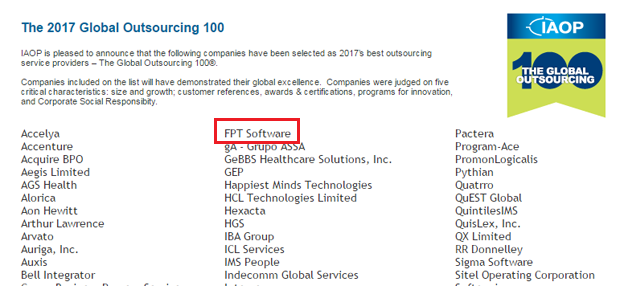 Theo thông tin từ trang nội bộ của Tập đoàn FPT Chungta.vn, danh sách được xác định bởi Hiệp Hội quốc tế về dịch vụ thuê ngoài chuyên nghiệp (IAOP) và được công bố thường niên trên Fortune - tạp chí nổi tiếng về kinh doanh toàn cầu. Đây là năm thứ 12 IAOP công bố danh sách này và FPT Software lần thứ tư liên tiếp được vinh danh.