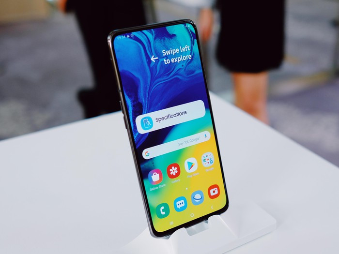 Galaxy A80 có màn hình 6,7 inch, độ phân giải Full HD+, sử dụng tấm nền Super AMOLED. Cấu hình của máy bao gồm chip Snapdragon 730G, RAM 8 GB và bộ nhớ 128 GB. Model này được trang bị cảm biến vân tay dưới màn hình, viên pin 3.700 mAh, tích hợp sạc nhanh 25 W.