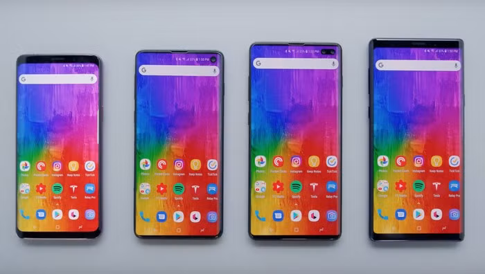 Galaxy S10 và S10+ có kích thước màn hình tương đương 6,1 inch cùng 6,4 inch. 2 model mới này có tổng thể nhỏ gọn ngay cả khi đặt cạnh Galaxy S9 và Note9, nhờ viền màn hình được làm mỏng đáng kể.