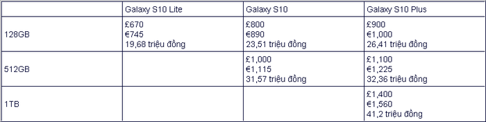 Dưới đây là bảng giá Galaxy S10 bị lộ dành cho nước Anh, dù vậy do quy định về bảo hành và thuế khác nhau, thiết bị có thể đắt/rẻ hơn tại thị trường khác. Ngoài ra, bản dung lượng 1TB có khả năng dành cho bản 5G, màn hình 6.7 inch và 6 camera. Nó sẽ được lên kệ sau các bản khác (quý II/2019 hoặc muộn hơn).