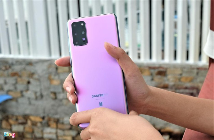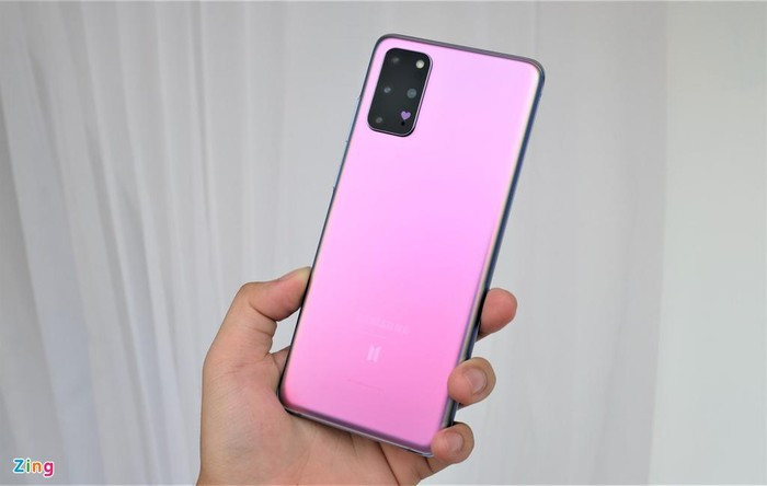 Về tổng thể, Galaxy S20+ phiên bản BTS có mặt lưng màu tím khá nữ tính. Samsung còn bổ sung một số chi tiết như biểu tượng của nhóm nhạc hay logo hình trái tim màu tím ở camera.