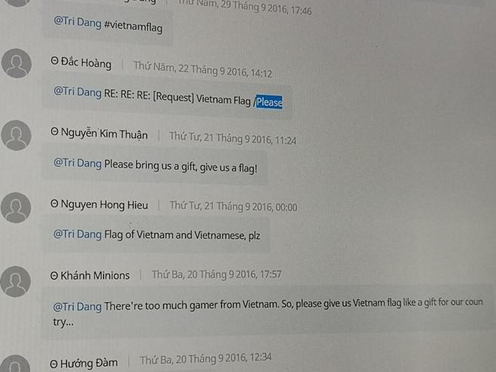 Bình luận bên dưới bài viết của Tri Dang, người chơi từ Việt Nam liên tục nhắc đi nhắc lại cụm từ "Vietnam's flag please" (tạm dịch: làm ơn có cờ Việt Nam)