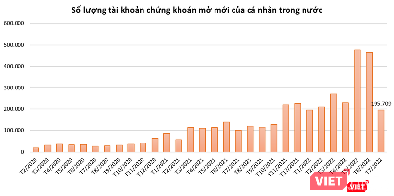 Số liệu từ Trung tâm lưu ký Chứng khoán Việt Nam (VSD) cho biết, nhà đầu tư cá nhân trong nước tiếp tục mở mới 195.709 tài khoản trong tháng 7/2022, giảm 58% so với số tài khoản mở mới trong tháng 6.