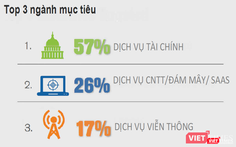 Ngành Tài chính là ngành thường xuyên bị tấn công nhất trong quý I/2018, chiếm 57% trong tổng số các hoạt động giảm thiểu. Ngành CNTT/ Đám mây/ SaaS có số lần tấn công DDoS cao thứ hai, chiếm 26% hoạt động giảm thiểu, tiếp theo là ngành viễn thông, chiếm 17%.