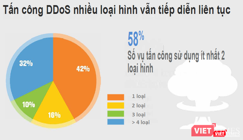 Verisign quan sát thấy 58% các vụ tấn công DDoS đã được giảm nhẹ trong quý I/2018 sử dụng nhiều loại hình tấn công khác nhau. So với quý 4/2017, số vụ tấn công tăng 53%, quy mô tấn công đỉnh điểm tăng 47%, tuy nhiên con số này giảm 21% so với cùng kì năm ngoái.