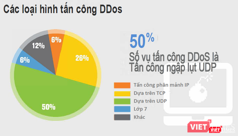 Theo Verisign, trong số các vụ tấn công DDOS, 50% số vụ tấn công là ngập lụt UDP (User Datagram Protocol), tấn công dựa trên TCP là hình thức tấn công phổ biến thứ 2, chiếm 26% các loại hình tấn công trong quý này