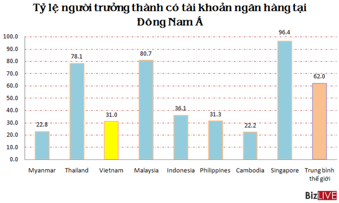 Tại Việt Nam, chỉ 31% người trưởng thành có tài khoản ngân hàng, bằng một nửa so với mức trung bình toàn thế giới tại 62%. Tỷ lệ này tại nông thôn là 19%. Việt Nam đứng thứ 119 trong danh sách của World Bank.