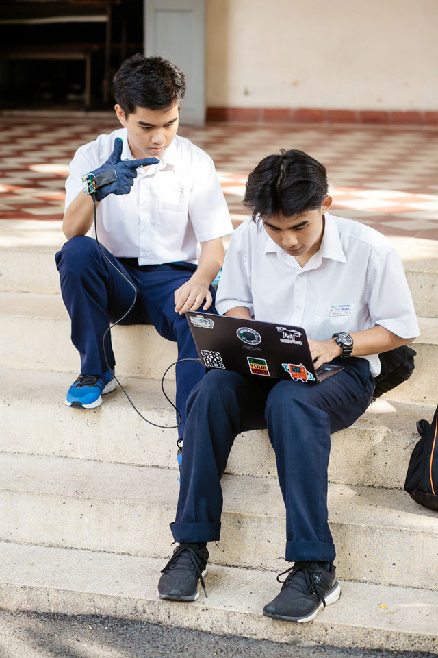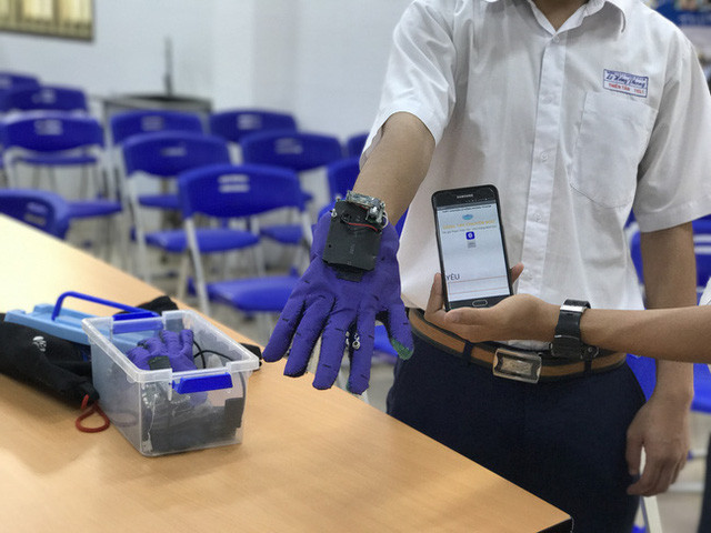 Hai nam sinh Sài Gòn giúp người câm điếc có thể nói chuyện bằng cách sử dụng một chiếc găng tay vải kết hợp với smartphone. Người đeo găng tay sẽ đưa ra các ngôn ngữ ký hiệu trong lúc đeo găng tay có gắn các cảm biến Flex Sensor và MPU6050.