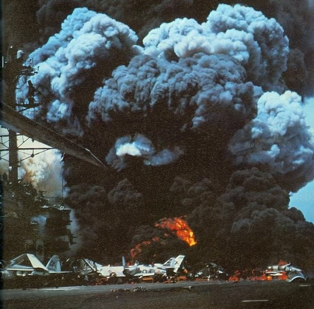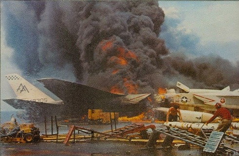 Vụ hỏa hoạn nổi tiếng đầu tiên xảy ra vào ngày 26.10.1966 trên tàu sân bay "Oriskany" trong thời gian chuẩn bị máy bay cho cuộc không kích miền Bắc Việt Nam. Do thiếu cẩn trong khi làm việc với các tên lửa pháo sáng magiê và các tên lửa này bốc cháy. Trong khoảng khắc ngọn lửa bao chùm cả phần khoang chứa máy bay mũi tàu và các buồng công tác có chung vách ngăn. Ngọn lửa đe dọa kích nổ bom, đạn và các thùng ô xy hóa lỏng.