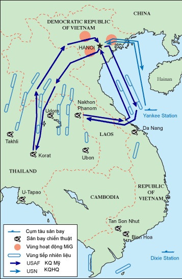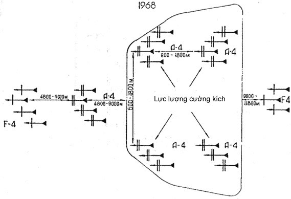 Đội hình tác chiến không kích các mục tiêu ở miền Bắc Việt Nam được chia ra thành 5 cụm phi đội công kích chủ lực: Nhóm các phi đội cường kích ném bom, nhóm phi đội tiêm kích khống chế bầu trời, nhóm phi đội chế áp tên lửa phòng không, nhóm phi đội chế áp pháo phòng không, nhóm phi đội che chắn và bảo vệ phía sau. Khoảng cách giữa các nhóm từ 4800 đến 9000 m, khoảng cách giữa các máy bay — từ 150 đến 400 m.