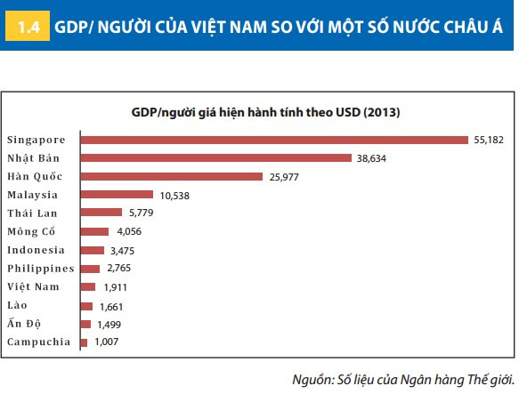 “Nếu tính theo sức mua tương đương giá hiện hành, năm 2013, Việt Nam đạt 5.294 USD/người. Trong số các nước châu Á được so sánh, các nước phát triển như Singapore, Nhật Bản, Hàn Quốc đạt mức rất cao, trong đó cao nhất là Singapore đạt trên 55.000 USD/người” – báo cáo nhận định.