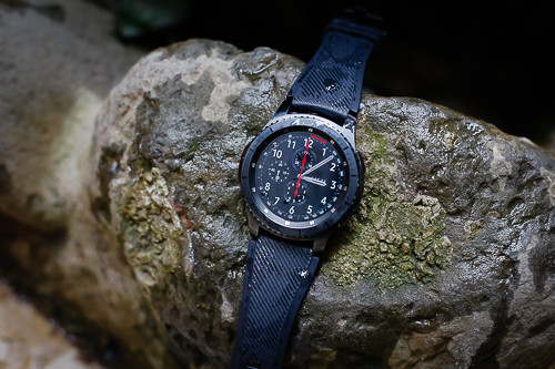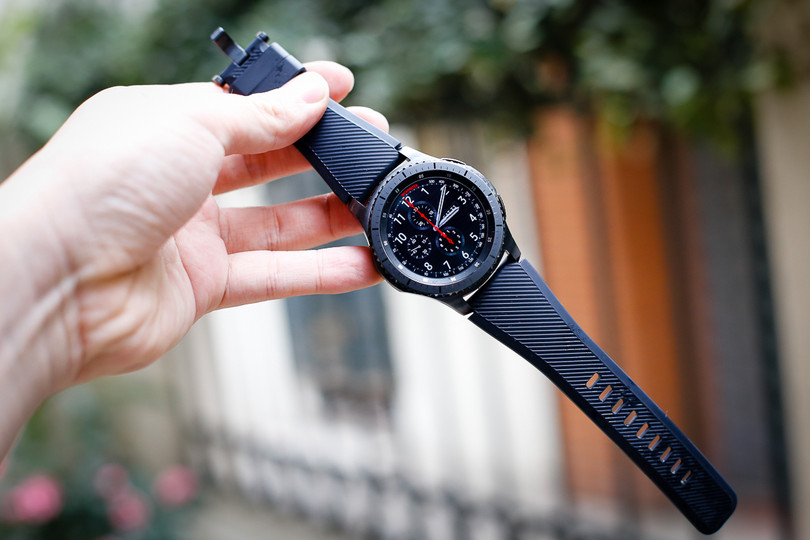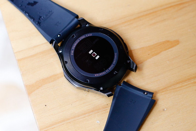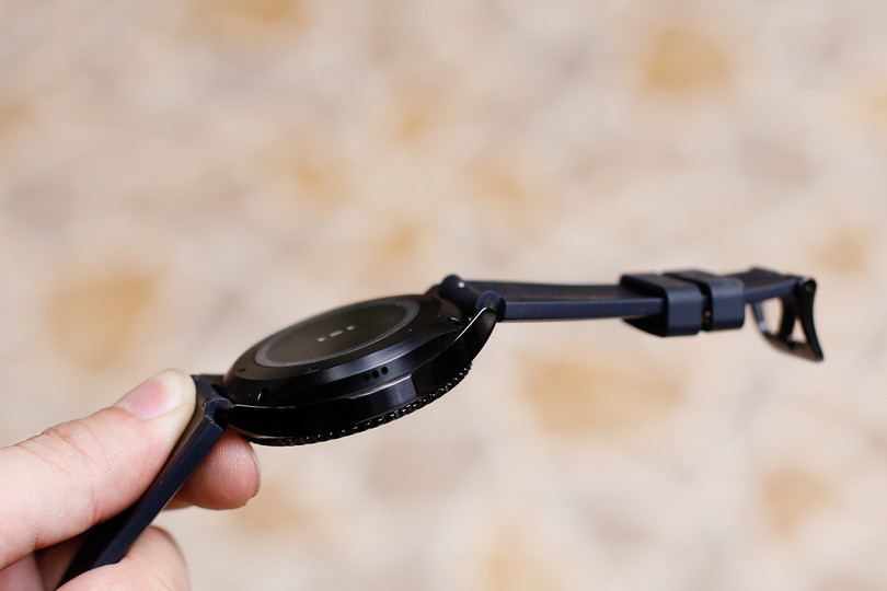 Mặt đồng hồ lớn và đeo nặng tay với trọng lượng 63 gram là hạn chế. Nếu là người không thường xuyên diện đồng hồ thể thao hoặc đã quen dùng vòng đeo thông minh, Gear S3 Frontier sẽ tạo ra chút bỡ ngỡ và khó chịu ban đầu. Dây cao su đi kèm còn hơi dày và cứng khi mới sử dụng. Sử dụng bản lề thông dụng 22 mm nên không khó để đổi dây đeo khác theo ý muốn.