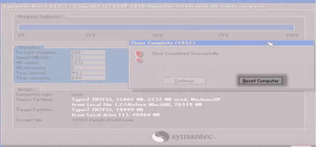 Ghost thành công, Norton ghost sẽ hiển thị thông báo. Lúc này, bạn chọn Resert Computer để khởi động lại máy.