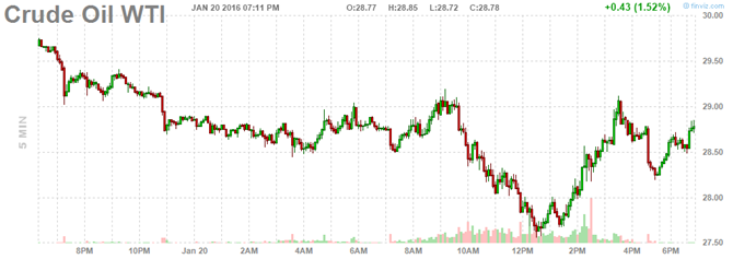 Phiên giao dịch Thứ Năm (21/01) trên sàn New York Mercantile Exchange, giá dầu thô Mỹ giao tháng Hai tiếp tục giảm 1,91USD (-6,7%), xuống chốt ở 26,55USD/thùng, khoét đáy kể từ 7/5/2003.