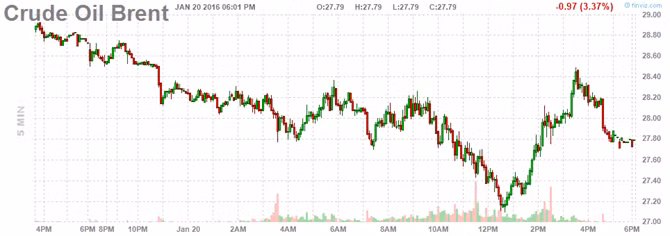 Còn trên sàn ICE Futures Europe, giá dầu Brent giao tháng Ba giảm 91 cent (-3,2%), lùi về 27,87USD/thùng - thấp nhất kể từ 24/11/2003.