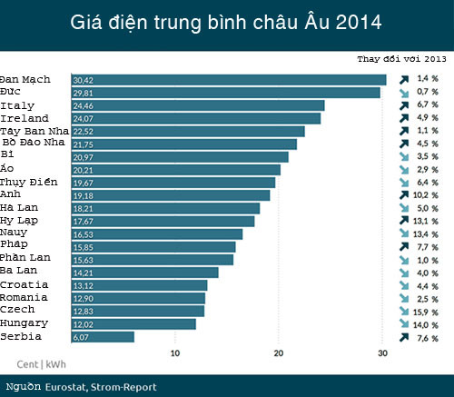 Đan Mạch hiện là nước có giá điện cao nhất. Mỗi kWh tại đây có giá 30,42 cent euro (tương đương 33,4 cent Mỹ), cao gấp 5 lần so với nơi có giá thấp nhất là Serbia - 6,67 cent Mỹ. Nhóm trung bình của khu vực này có giá điện quanh mức 16-20 cent một kWh.