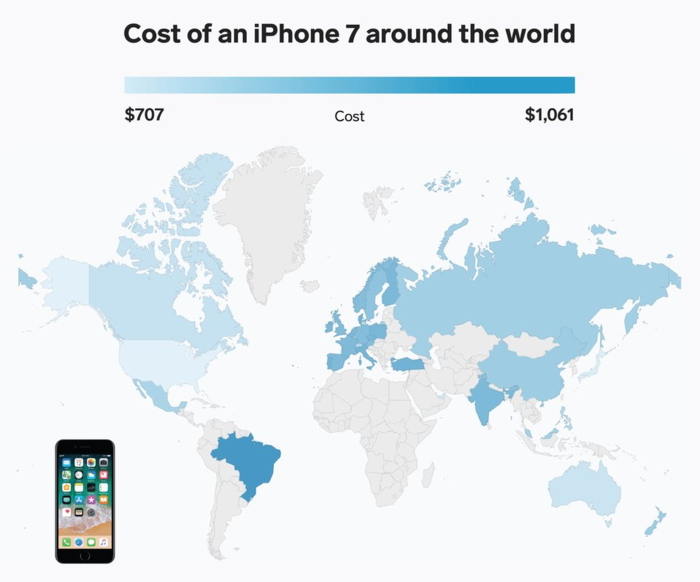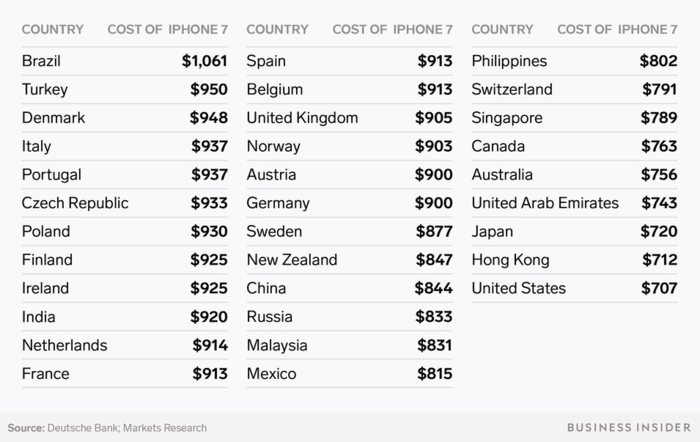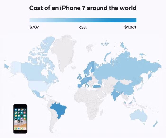 Nơi bán iPhone 7 rẻ nhất hiện nay là tại Mỹ với 707 USD và đắt nhất là tại Brazil, chênh lệch hơn 350 USD với giá 1061 USD. Sở dĩ giá iPhone tại Brazil luôn nằm trong top đắt nhất từ trước đến nay là bởi thuế nhập khẩu đối với các mặt hàng bán lẻ bị đánh rất cao.