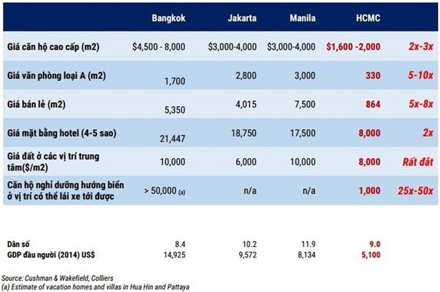 Trong một buổi hội nghị về cơ hội đầu tư bất động sản mới đây tại Tp.HCM, ông Nguyễn Nam Sơn –CEO của Vietnam Capital Partners Ltd đã đưa ra so sánh khá thú vị về giá các loại hình BĐS tại Tp.HCM với các đô thị có quy mô dân số tương tự.