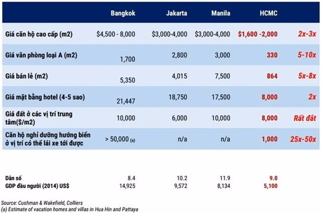 Còn theo CBRE, một công ty tư vấn quốc tế chuyên nghiên cứu về thị trường BĐS các nước trên toàn cầu, cho thấy mức trung bình của căn hộ cao cấp ở Tp.HCM khoảng 1.781 USD/m2 tức cỡ khoảng 178.000 USD mỗi căn hộ khoảng 100m2. Nhưng, căn hộ tương tự ở Singapore, Thượng Hải, Malaysia có giá khoảng 500.000 – 600.000 USD, cao gấp 3-4 lần.