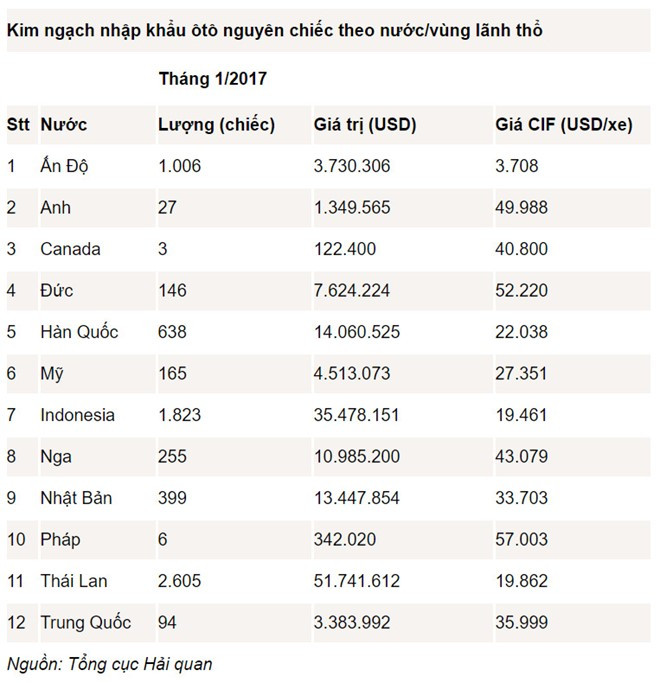Ngoại trừ trường hợp Ấn Độ thì trong danh sách 12 quốc gia và vùng lãnh thổ xuất khẩu ôtô nguyên chiếc vào Việt Nam, giá nhập khẩu của ôtô Thái Lan và Indonesia ở mức thấp hơn cả, đều dưới mốc 20.000 USD mỗi chiếc.