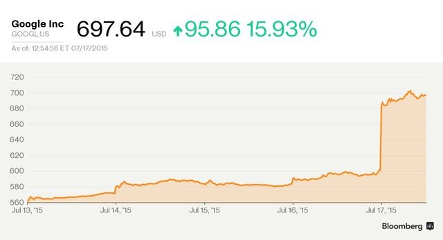 Kết thúc phiên hôm qua, cổ phiếu Google tăng 16%, lên mức cao kỷ lục 699,62 USD, đóng góp tới 39 điểm trong số 47 điểm tăng thêm của chỉ số Nasdaq.