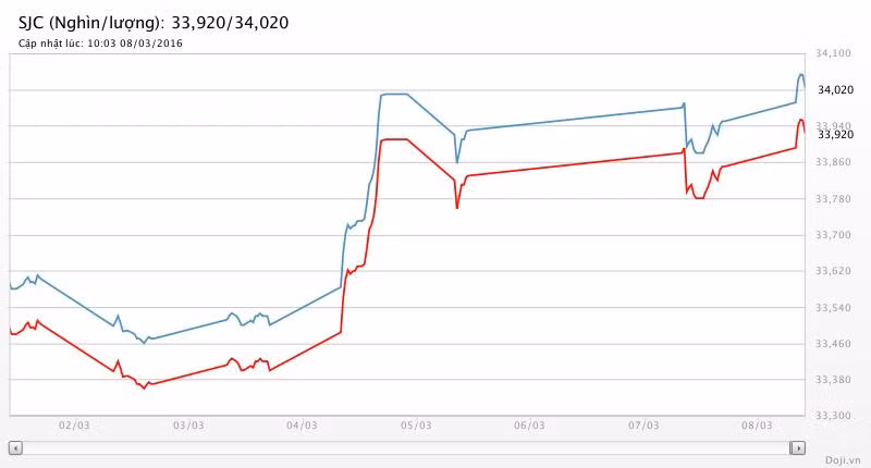 Trong khi, tại Doji, giá vàng miếng SJC lại được Tập đoàn điều chỉnh tăng 70 đồng mỗi chiều lên niêm yết ở 33,92 – 34,02 triệu đồng/lượng (MV-BR) đối với giao dịch lẻ; và đắt hơn 10 nghìn đồng chiều mua, đồng thời rẻ hơn 10 nghìn đồng chiều bán đối với giao dịch buôn ở thị trường Hà Nội. Hiện, doãng chênh lệch 2 chiều mua-bán ở Doji vẫn là 100 nghìn đồng/lượng.